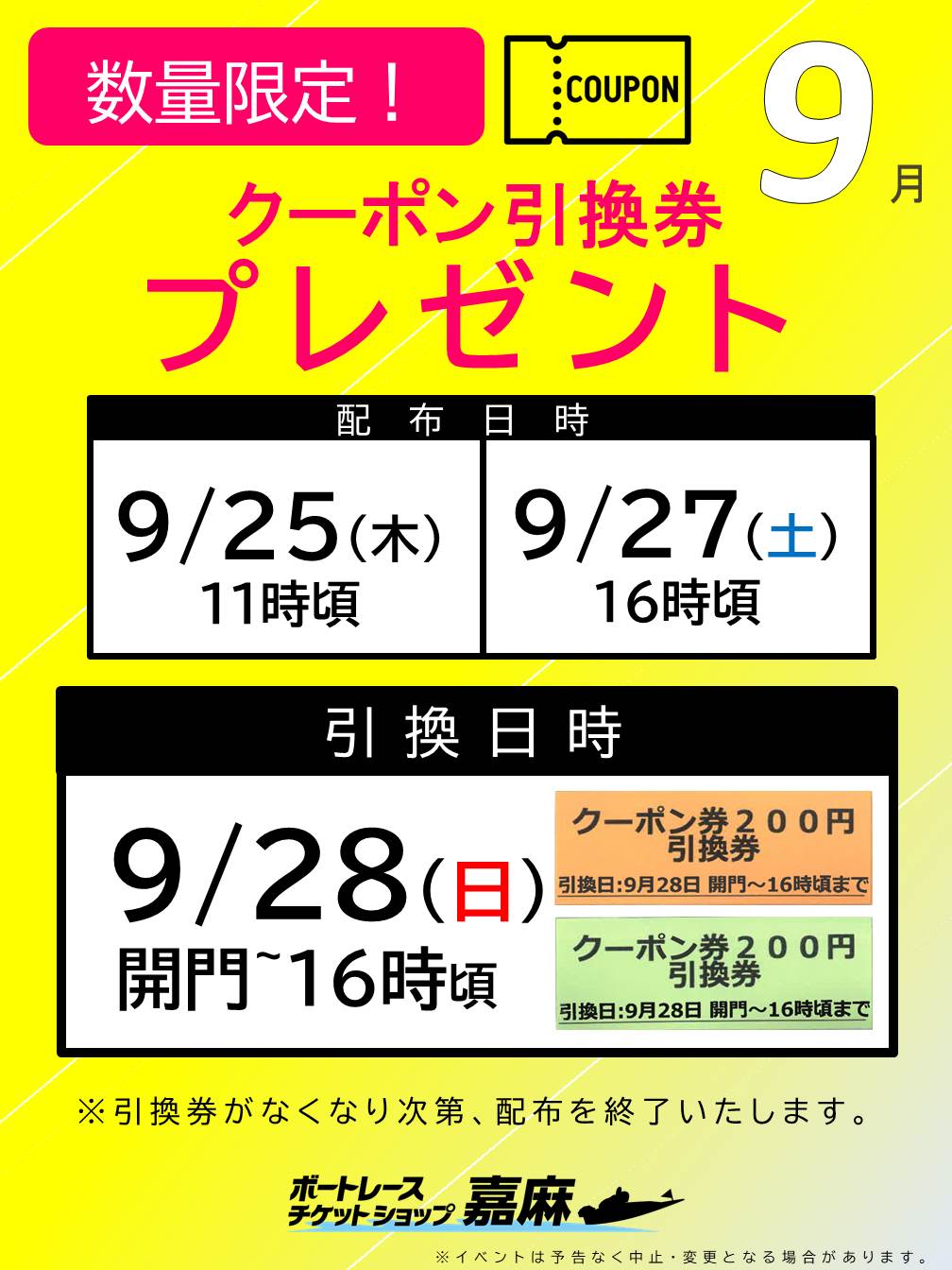 9月25日、27日 クーポン引換券配布イベント実施! 【9月25日・27日の 2日間クーポン引換券配布イベント実施】 【内容】 9月28日に利用できる200円分クーポン引換券をプレゼントいたします♪ ※引換クーポン券の有効期限は9月28日まで! ぜひボートレースチケットショップ嘉麻へお越しください^^ お知らせ一覧へ