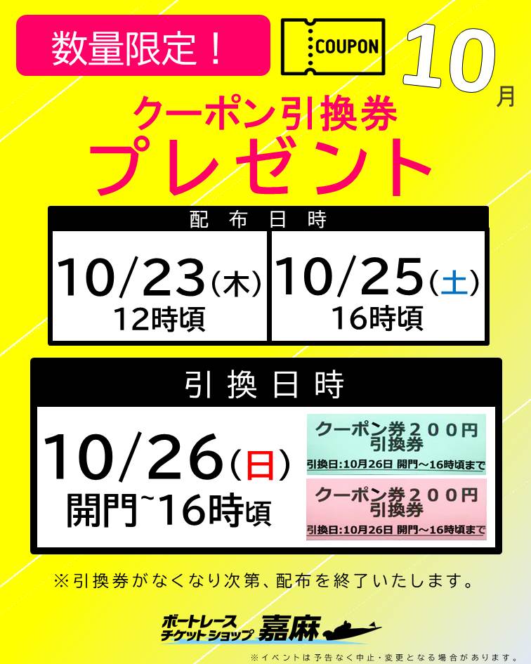 10月23日、25日 クーポン引換券配布イベント実施! 【10月23日・25日の 2日間クーポン引換券配布イベント実施】 【内容】 10月26日に利用できる200円分クーポン引換券をプレゼントいたします♪ ※引換クーポン券の有効期限は10月26日まで! ぜひボートレースチケットショップ嘉麻へお越しください^^ お知らせ一覧へ