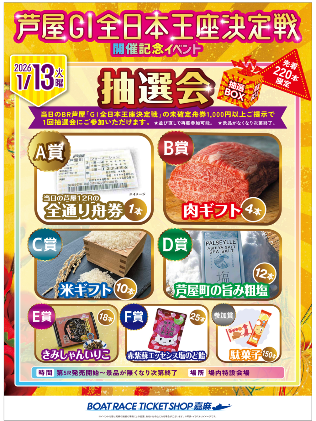【1.13(火)GI芦屋 抽選会実施 ♪】 【1.13(火) GI芦屋抽選会!】 芦屋GI全日本王座決定戦 開催記念イベント♪ 1.13(火)当日のBR芦屋 未確定舟券1,000円以上掲示で1回抽選にご参加いただけます! 景品がなくなり次第終了の限定イベント♪ 皆様のご来場をお待ちしております^^ お知らせ一覧へ