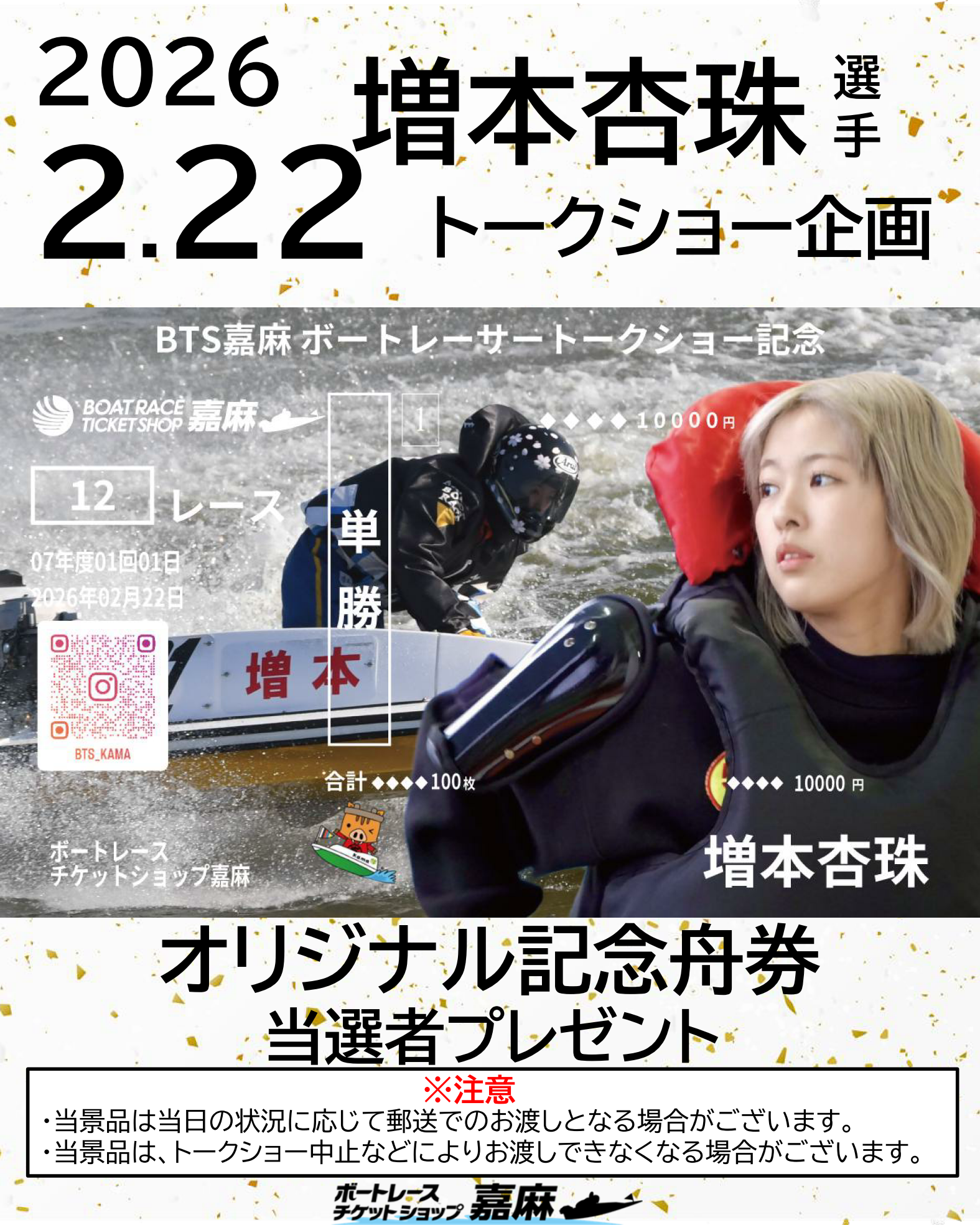 ボートレーサートークショー特別企画!!オリジナル記念舟券抽選でプレゼント! 🎁【イベント限定企画】🎁 トークショー開催記念! 増本杏珠選手オリジナル記念舟券(限定カード)を抽選でプレゼント✨ 📌トークショー第1部終了後、 先着で抽選券を配布いたします! ※抽選券がなくなり次第終了 ここでしか手に入らない限定アイテムをぜひゲットしてください! お知らせ一覧へ