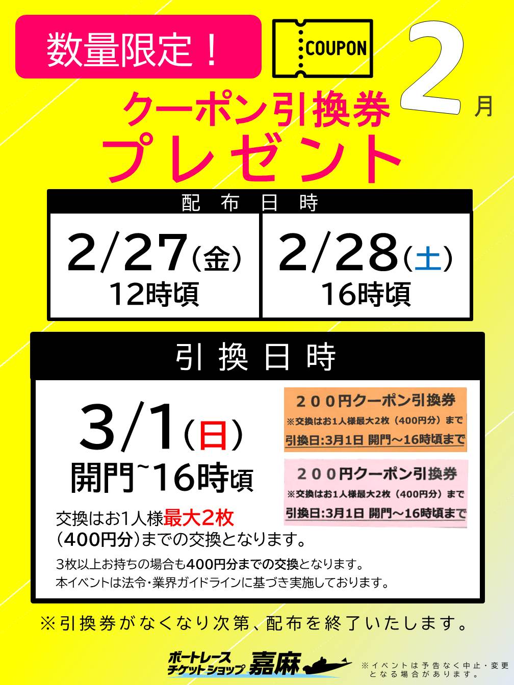 2月27日、28日 クーポン引換券配布イベント実施! 【2月27日・28日の 2日間クーポン引換券配布イベント実施】 【内容】 3月1日に利用できる200円分クーポン引換券をプレゼントいたします♪ ※引換クーポン券の有効期限は3月1日まで! 2日集めると… 400円分のクーポンに交換できます!(最大400円まで) ぜひボートレースチケットショップ嘉麻へお越しください^^ お知らせ一覧へ