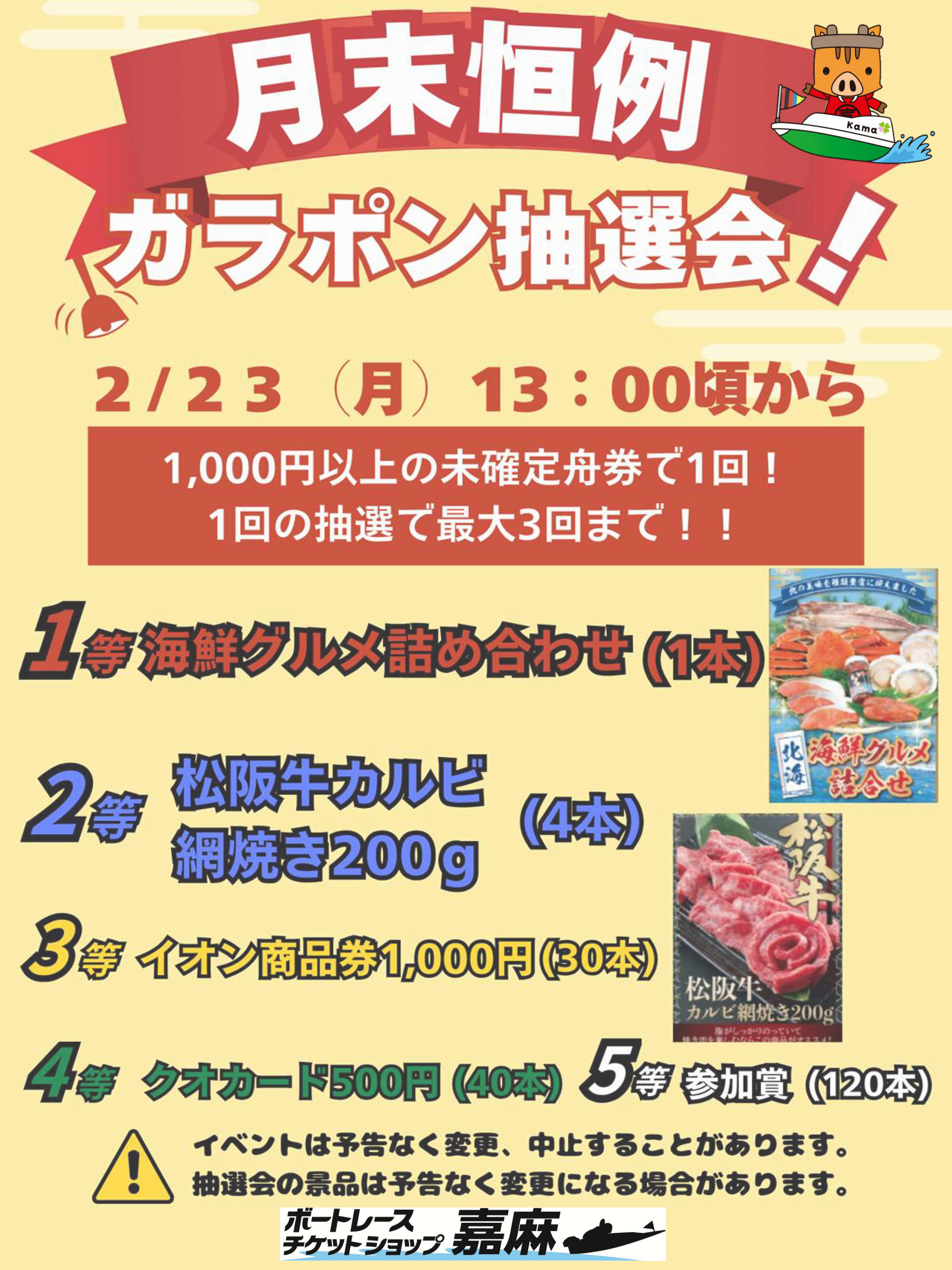 【2/23(月)抽選会イベント】 2/23(月)13:00頃よりボートレースチケットショップ嘉麻にてガラポン抽選会を実施! ハズレなしの抽選会にぜひご参加ください(*^^*) 皆様のご来場を心よりお待ちしております! お知らせ一覧へ