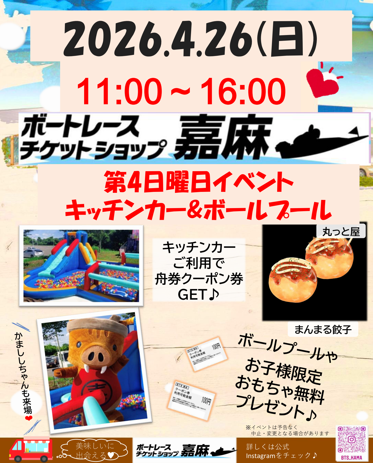 4月26日(日)第4日曜日イベント開催のお知らせ 第4日曜日イベント開催のお知らせ! 4月26日(日)、ボートレースチケットショップ嘉麻にて第4日曜イベントを開催いたします! 当日は まんまる餃子キッチンカーが来場予定! さらにお得な特典もご用意しています!🎟 キッチンカーで500円以上お買い上げの方に「100円クーポン券」プレゼント!🎁 お子様には無料おもちゃプレゼント! 無料のボールプールも利用出来ます。 かまししちゃんも登場するかも! 美味しいグルメと楽しい特典がいっぱいの一日。皆さまのご来場を心よりお待ちしております! お知らせ一覧へ