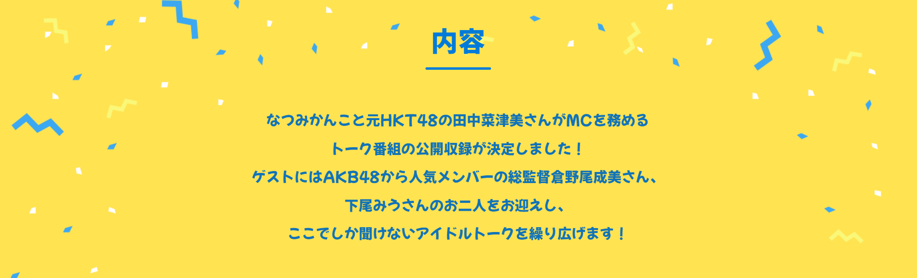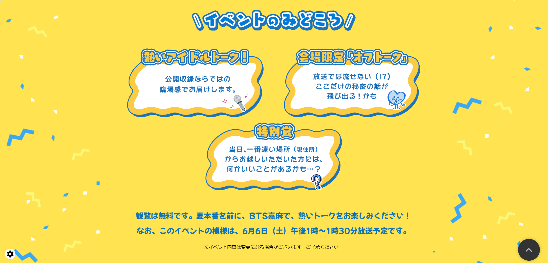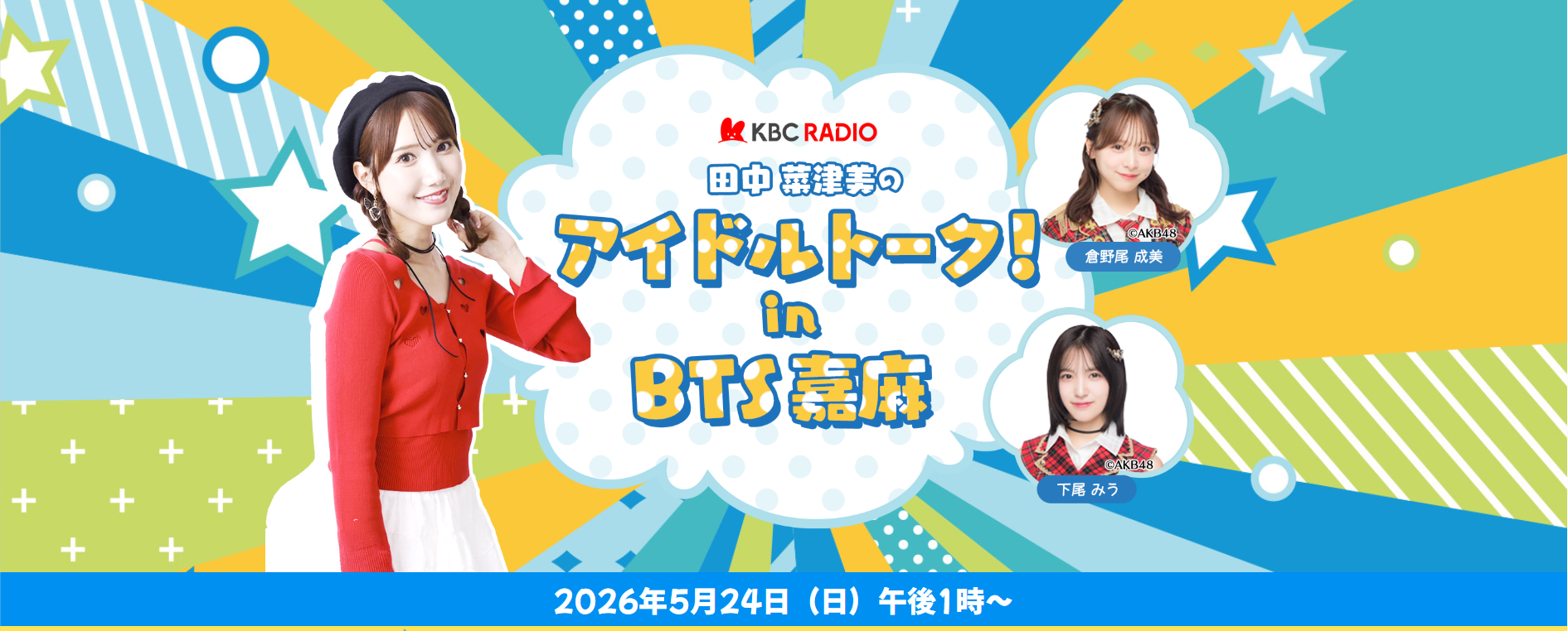 【5月24日 田中菜津美のアイドルトーク!in BTS嘉麻】 イベント概要 【イベント日時】 2026年5月24日(日)午後1時~ 【会場】 ボートレースチケットショップ嘉麻特設ステージ(嘉麻市岩崎字折口63-17) (正面玄関エリアが1日限定の放送席に!) 【出演】 MC/田中 菜津美 ゲスト/倉野尾 成美 ゲスト/下尾 みう 【アクセス】 JR/筑豊本線 新飯塚駅から約8km 自動車/九州自動車道福岡インターから約30km 駐車場約400台 福岡県内各地からのアクセス例はこちら 【備考】 ※観覧無料(※撮影タイムを設ける予定です) お知らせ一覧へ